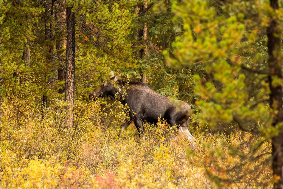 This beautiful moose looked amazing in this autumn meadow. Snow in Moraine Lake that morning, was rain lower in the valley. This created a glow in the grass and a shine on her coat.