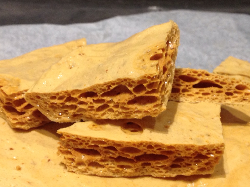 You need to move briskly when making this so have the bicarbonate already measured out and the baking sheet lined, use a medium to large pan as the honeycomb rises rapidly as soon as you add the bicarbonate and whisk it in.
